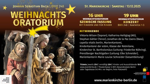 Viktoria Wilson (Sopran), Katharina Heiligtag (Alt), Stephan Gähler (Tenor), Jonathan de la Paz Zaens (Bass), MarienKantorei, KinderKantorei der esbm, Prenzlberger Nachtigallen (Leitung: Elke Schneider), Marienkantorin Marie-Louise Schneider (Gesamtle