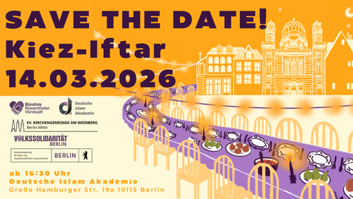 Veranstaltet wird der Abend vom Bündnis Rosenthaler Vorstadt, der Deutschen Islam Akademie, der Ev. Kirchengemeinde am Weinberg Berlin-Mitte und der Volkssolidarität Berlin.