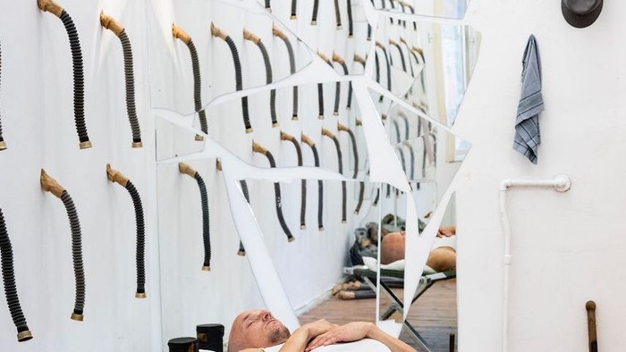 In der Performance wird die Geschichte eines Soldaten, eines Heimkehrers und Zurückkehrers erzählt. Er ruht auf einem Feldbett im Chor der Kirche und wird zur Waffe gerufen, doch er rührt sich nicht. Eine zurückhaltende Klang-Collage aus Meeresrauschen und Wind, einem Hühnerstall und dem Läuten diverser Glocken mischen sich mit Geräuschen von Drohnen, Helikoptern, Kampfjets, Sirenen und Detonationen sowie abstrakten Klängen. Sie wird getragen von einem sich Mantra-ähnlich wiederholenden Text: der Aufforderung zum Dienst an der Waffe. Dieser zeitversetzte Weck-Ruf scheint zu verhallen. Der Resonanzraum des Rückzugsortes in der St.-Thomas-Kirche erweist sich als eine surrealistische Inszenierung einer Utopie aus Artefakten des Vergangenem; Spiegelfragmente, Werkzeuge, Gasmasken, sowie als imaginärer Sehnsuchtsort einer Zukunft zwischen Krieg und Frieden.