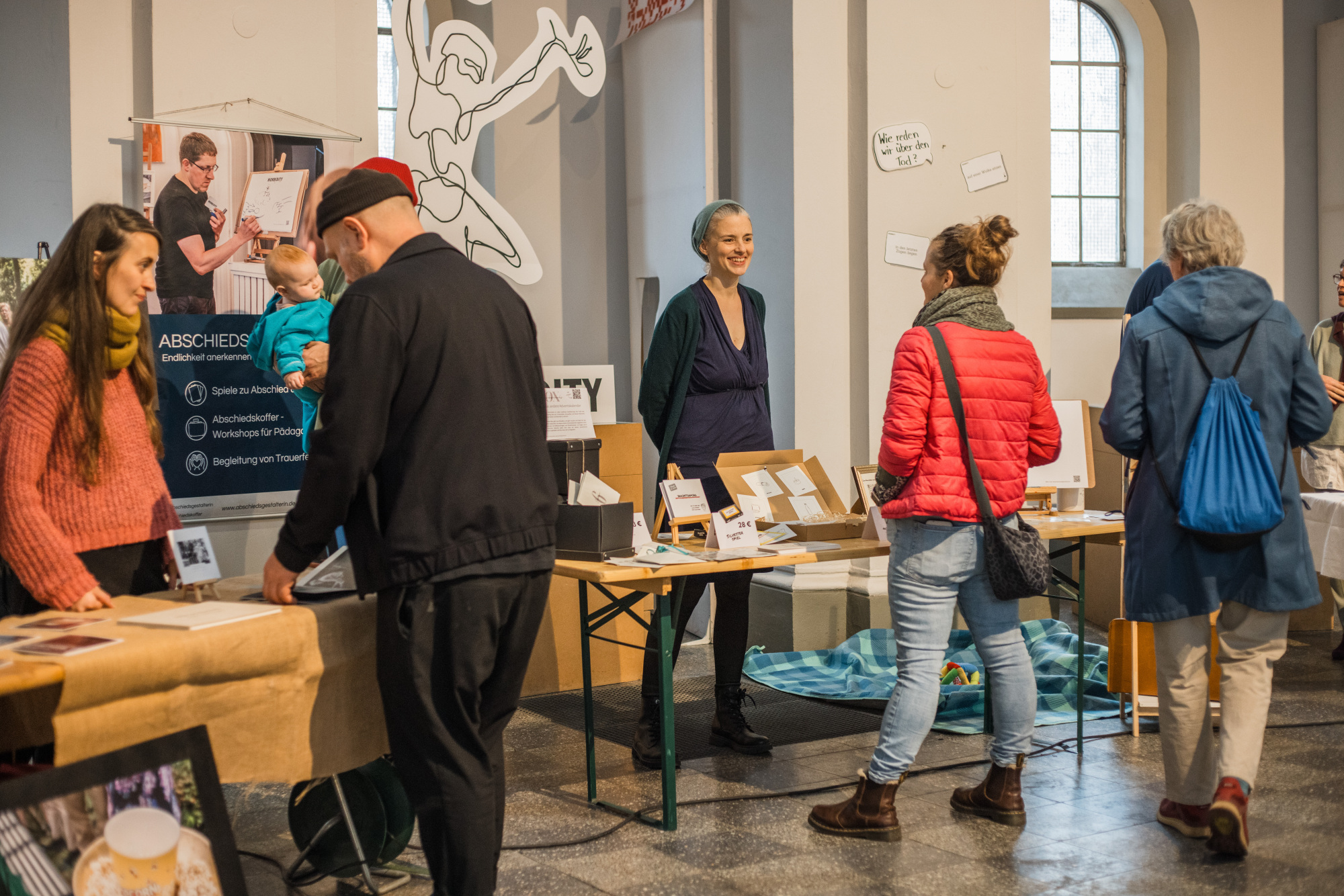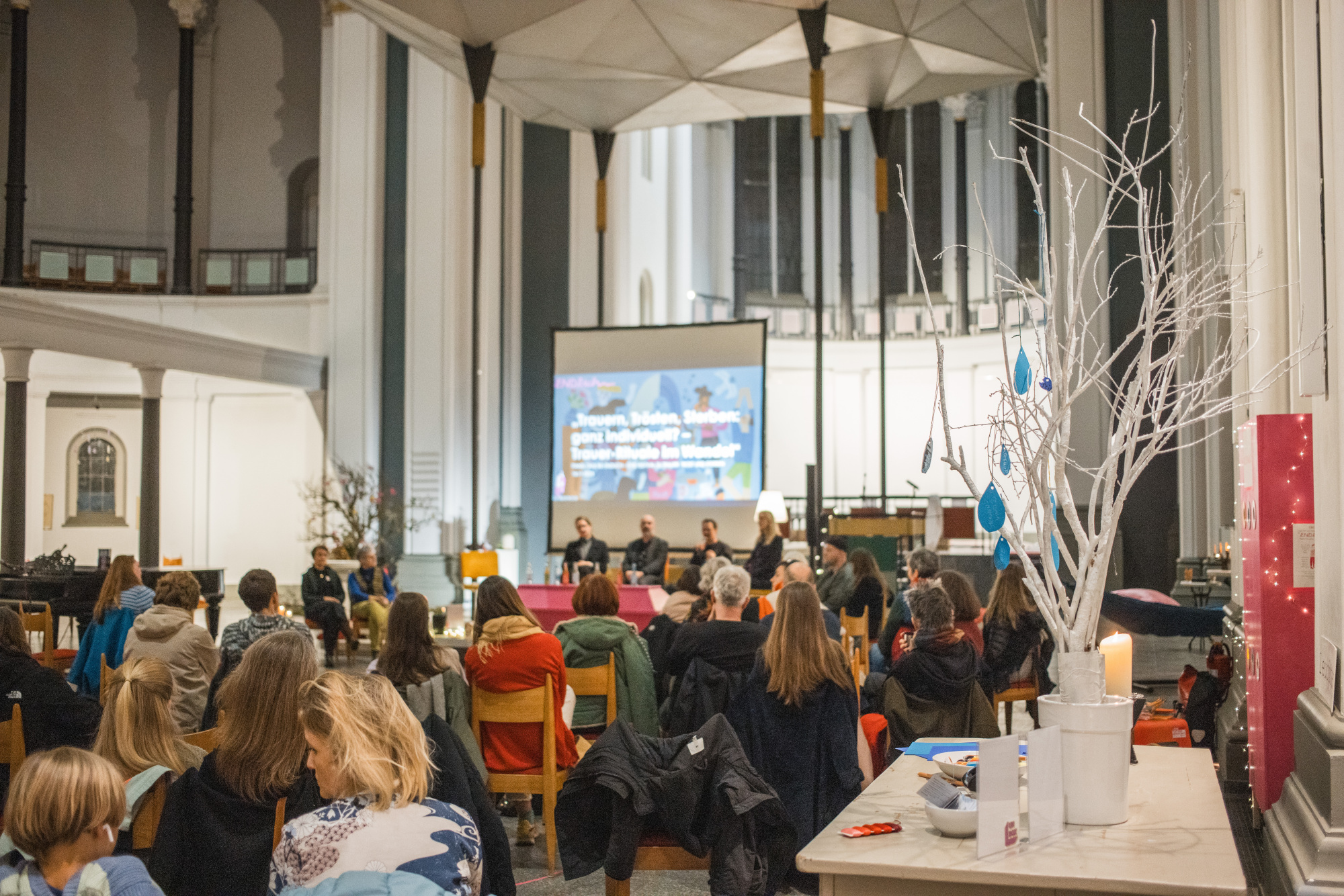 Zehn Tage wurde die St. Thomas-Kirche in Berlin Kreuzberg zum Anziehungspunkt für alle, die sich mit Trauer, Trost und Sterben auseinandersetzen wollten. Ein unglaublich engagiertes Team von Pfarrpersonen, Menschen von UNBOX und dem Segensbüro und vielen Helfenden hat ein vielseitiges Programm zusammengestellt: Von Trauer-Yoga über den Markt der Möglichkeiten, zahlreiche Workshops, einer spannenden Podiumsdiskussion bis zu Trauer, Tee, Tattoo. Fotografin Julia Vogel hat die schönsten Momente für uns festgehalten.