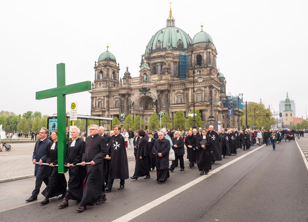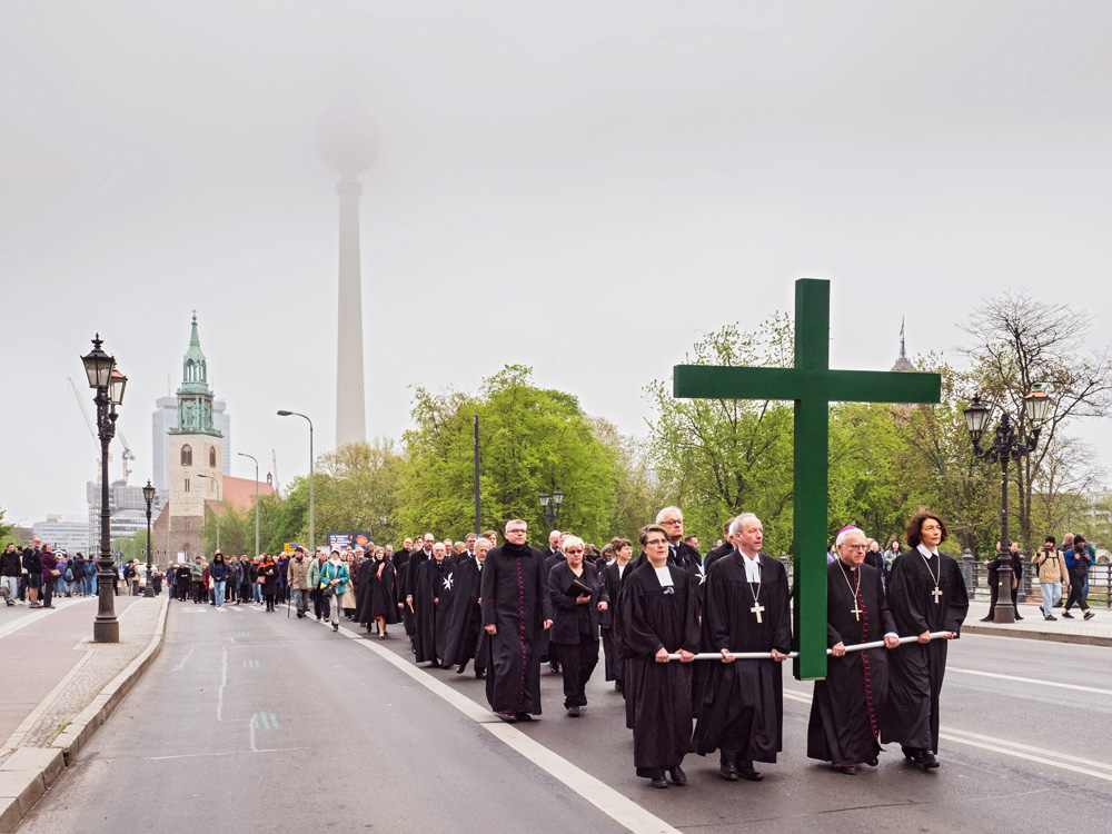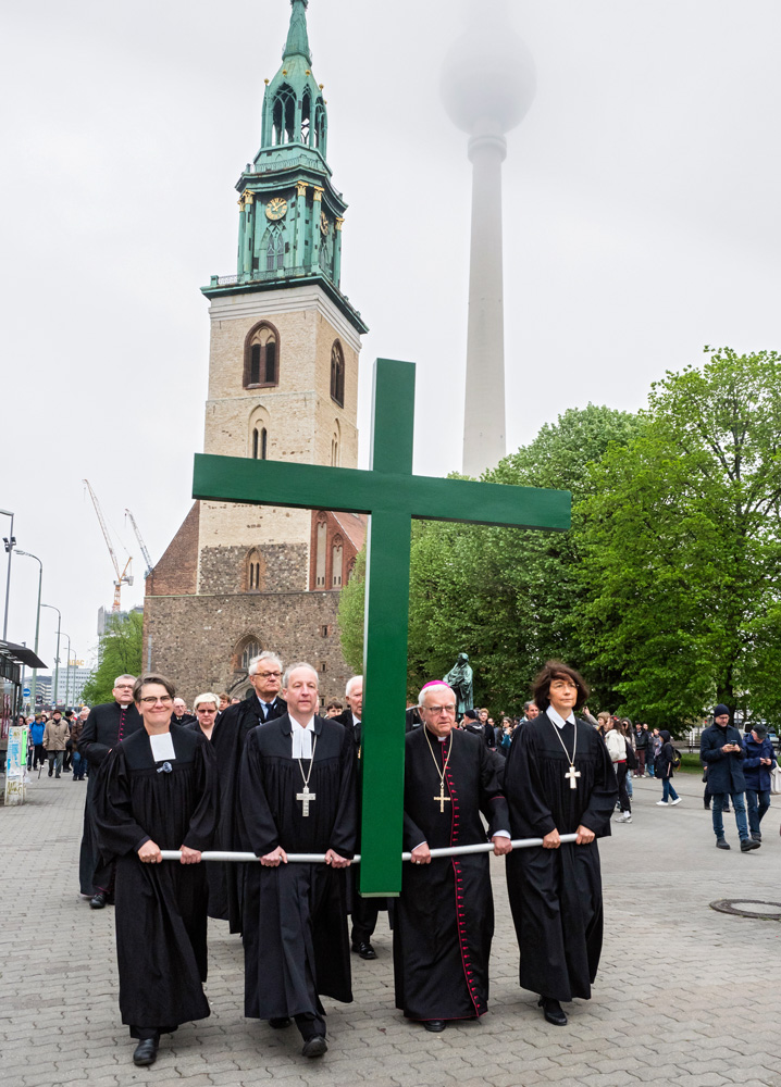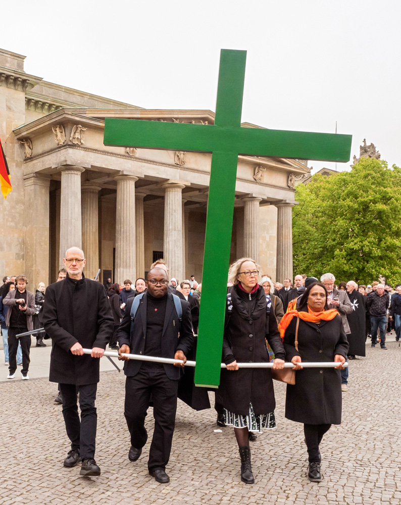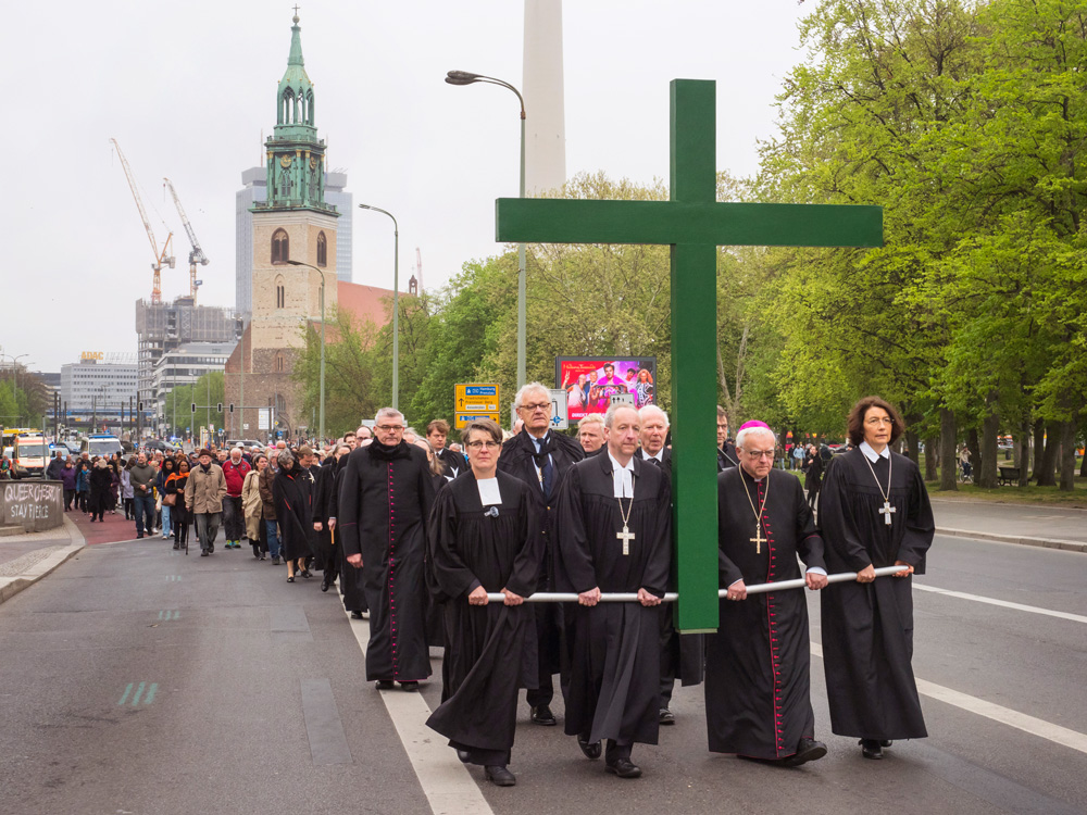 Auch in diesem Jahr erinnert die Berliner Karfreitagsprozession an Leidende in aller Welt. Menschen unterschiedlicher christlicher Konfessionen tragen am Karfreitag (18. April 2025) ein großes grünes Kreuz von der Berliner St. Marienkirche aus durch die Innenstadt. Dabei stoppt die Prozession an mehreren Stationen, unter anderen am Berliner Dom und Unter den Linden. Hier werden Texte vorgelesen, die an aktuell Leidende erinnern. Ihr Leid wird dem Leid Christi am Kreuz gegenübergestellt.