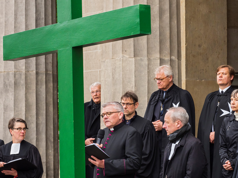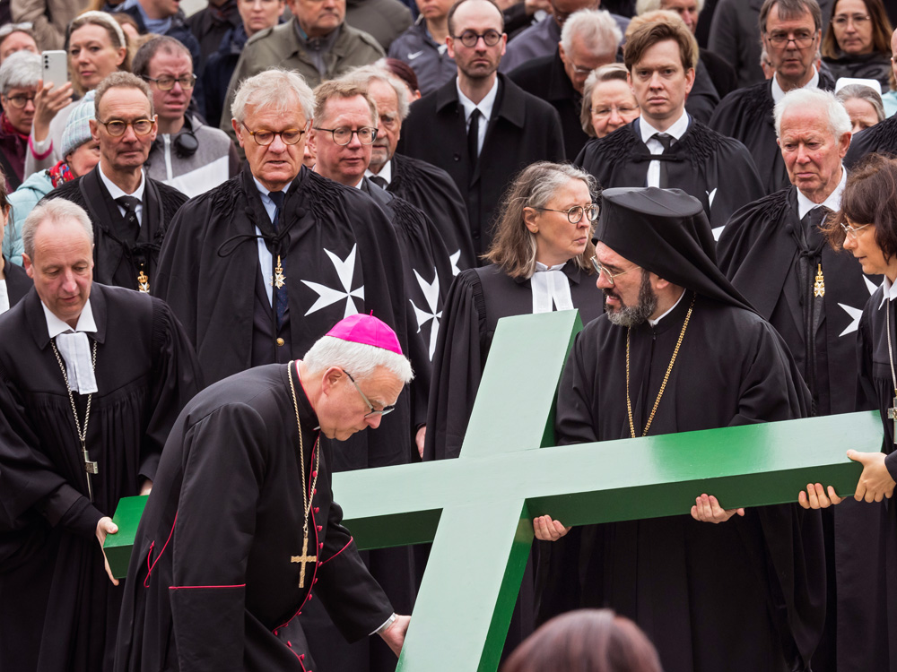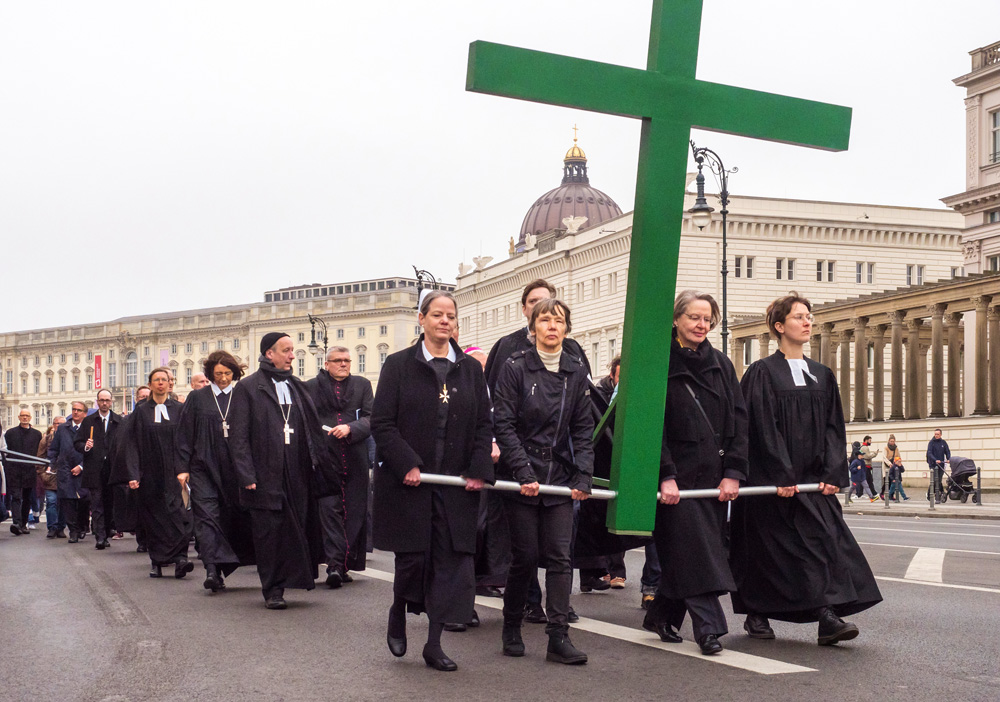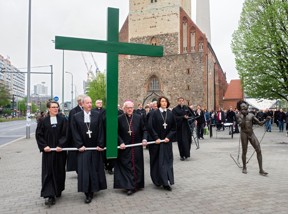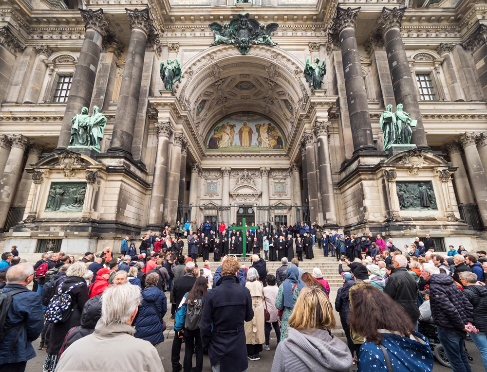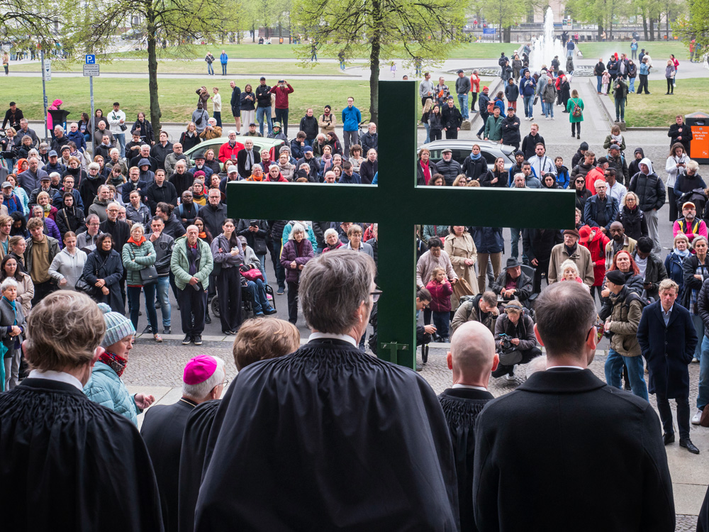 Auch in diesem Jahr erinnert die Berliner Karfreitagsprozession an Leidende in aller Welt. Menschen unterschiedlicher christlicher Konfessionen tragen am Karfreitag (18. April 2025) ein großes grünes Kreuz von der Berliner St. Marienkirche aus durch die Innenstadt. Dabei stoppt die Prozession an mehreren Stationen, unter anderen am Berliner Dom und Unter den Linden. Hier werden Texte vorgelesen, die an aktuell Leidende erinnern. Ihr Leid wird dem Leid Christi am Kreuz gegenübergestellt.