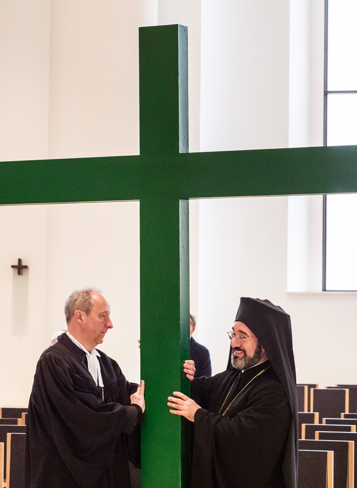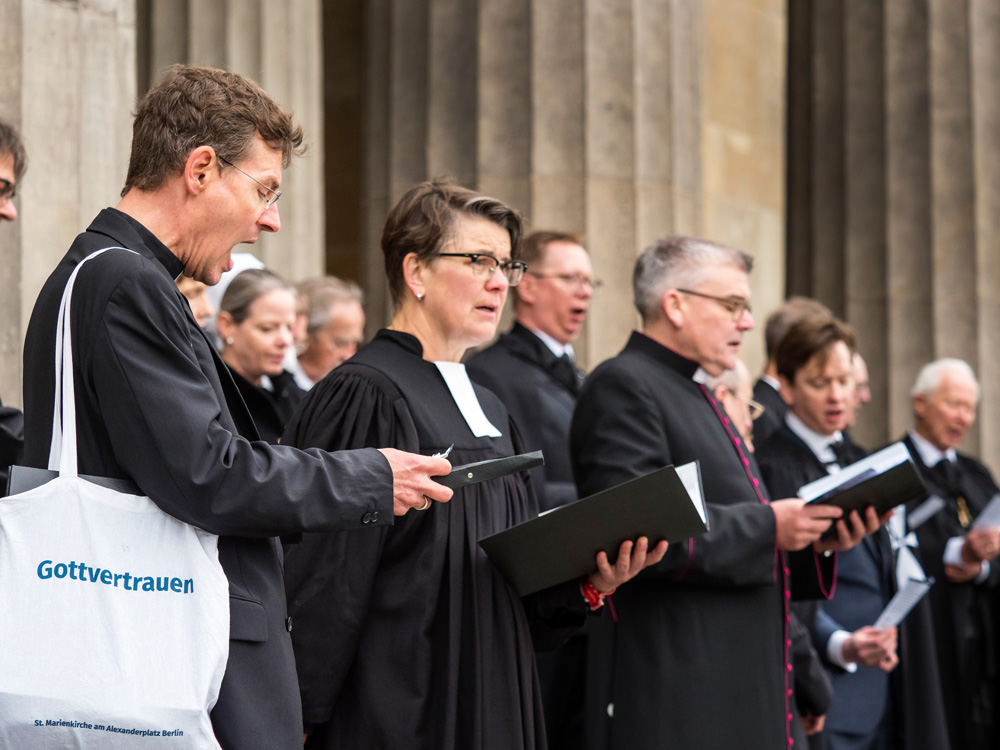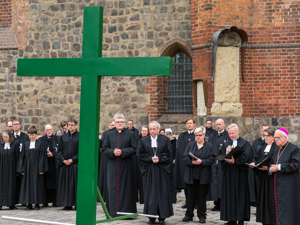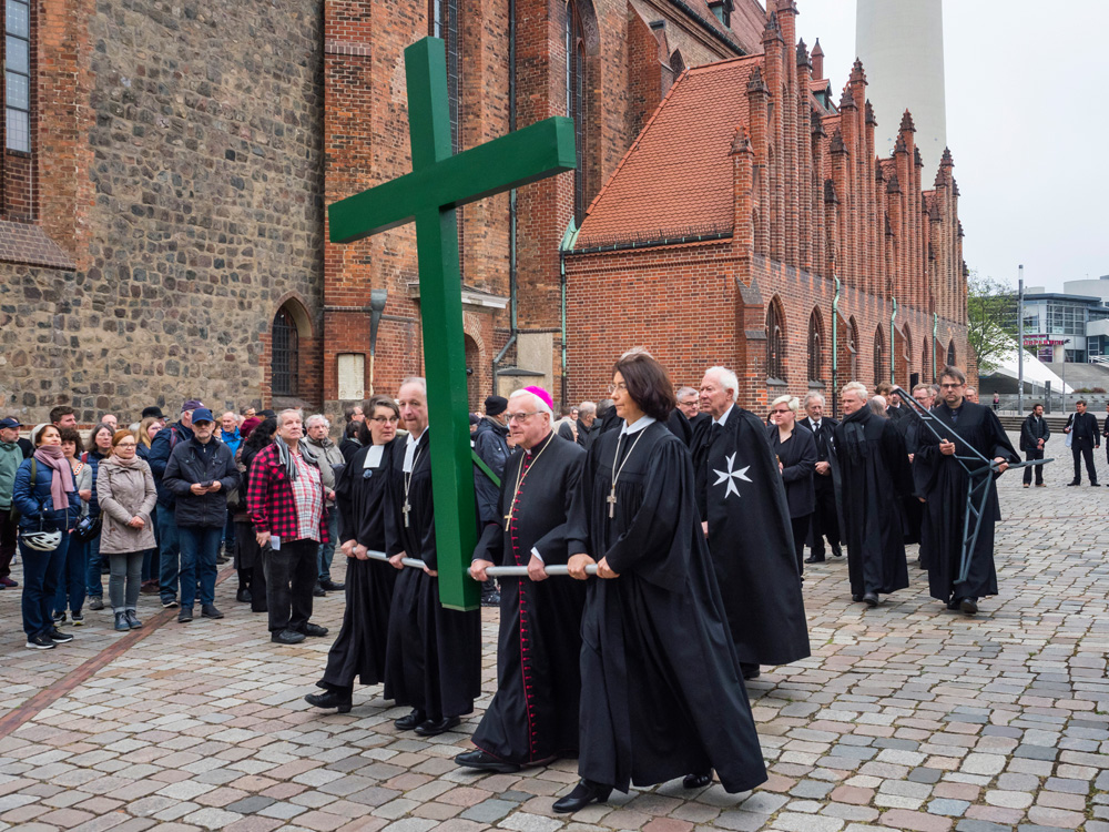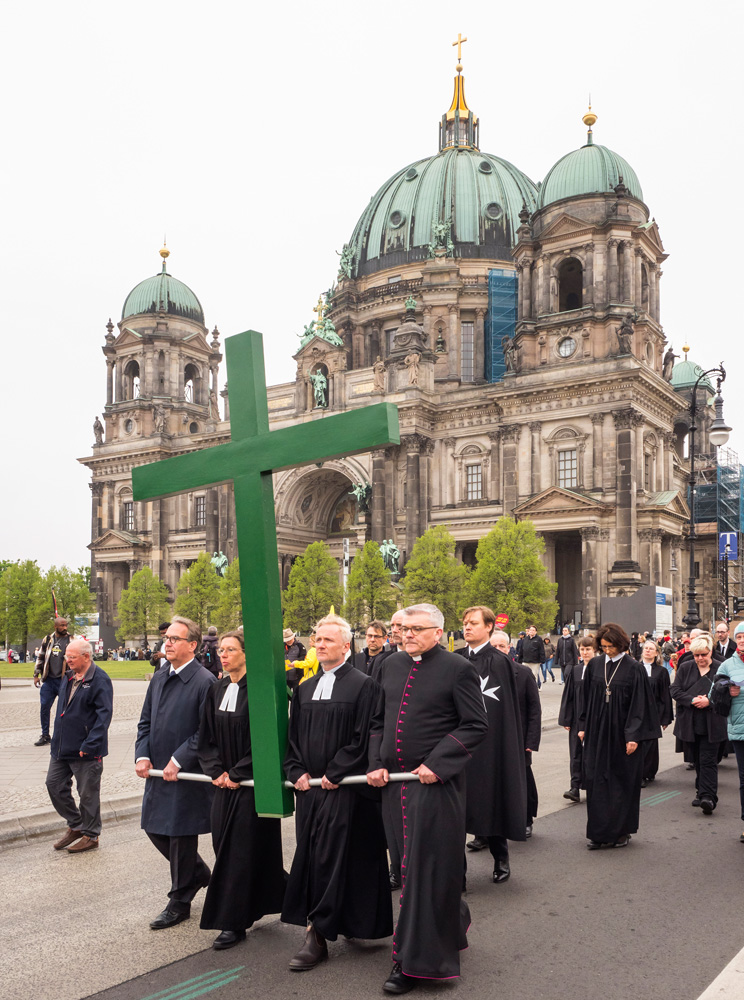 Bei der von der Evangelischen Kirche in Berlin Stadtmitte veranstalteten Karfreitagsprozession sind auch Glaubensgeschwister aus der Ökumene dabei. Bischof Stäblein, Erzbischof Koch und Bischof Emanuel repräsentieren diese ökumenische Glaubensvielfalt durch ihre Teilnahme.
